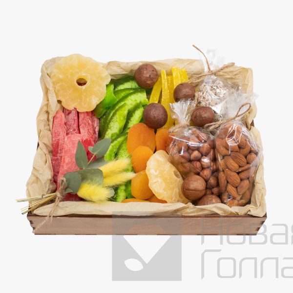 - макадамия орех 70 г миндаль 100 г фундук 100 г арахис в кунжуте 100 г ананас кольцо 100 г курага 100 г помело сушеное (зеленое) 150 г папайя желтая 100 г папайя красная 200 г Лагурус 3 шт Эвкалипт зелень тишью бумага Джут коробка деревянная 25*20 без крышки 1 шт