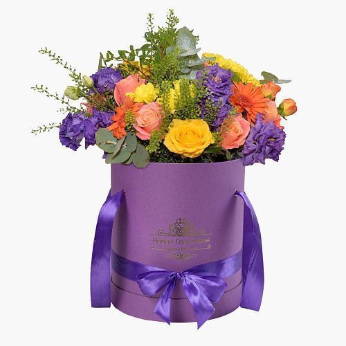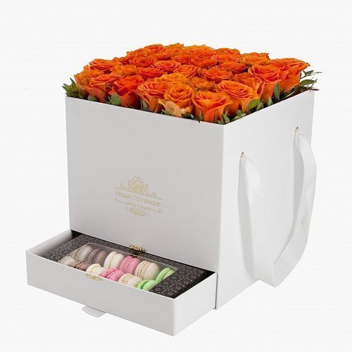 -10%35 оранжевых роз в большой белой коробке шкатулке с макарунсами